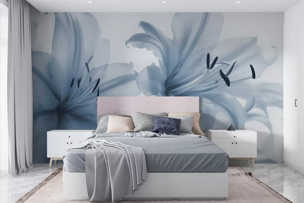 Murais de parede Close-up com foco suave de flores de lírio azuis minimalistas em um fundo claro Nr. w08586