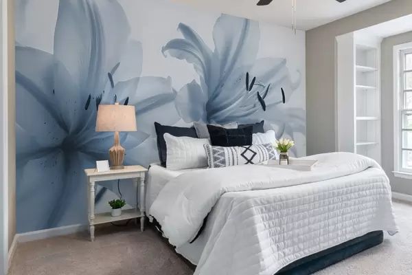 Murais de parede Close-up com foco suave de flores de lírio azuis minimalistas em um fundo claro Nr. w08586