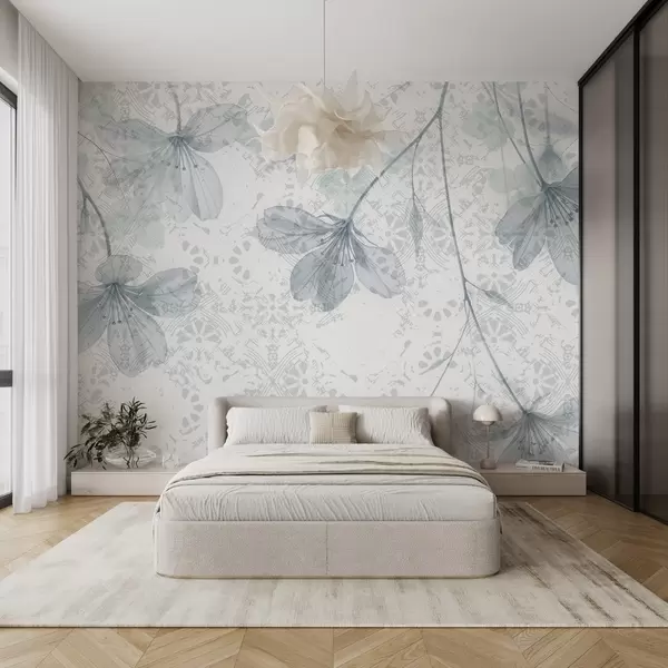 Murais de parede Delicadas flores azuis e brancas com longos caules e pétalas em um fundo texturizado suave e desfocado Nr. w08588