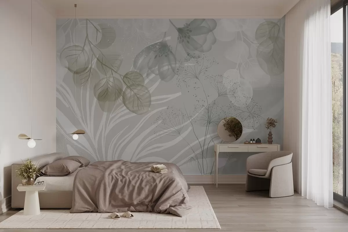 Murais de parede Elementos florais de eucalipto em tons de verde e branco com folhas e pétalas sobrepostas em um estilo minimalista Nr. w08599v1