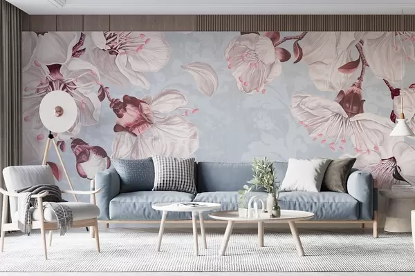 Murais de parede Uma estampa floral com grandes flores de cerejeira rosa e branca em um fundo texturizado azul claro Nr. w08601