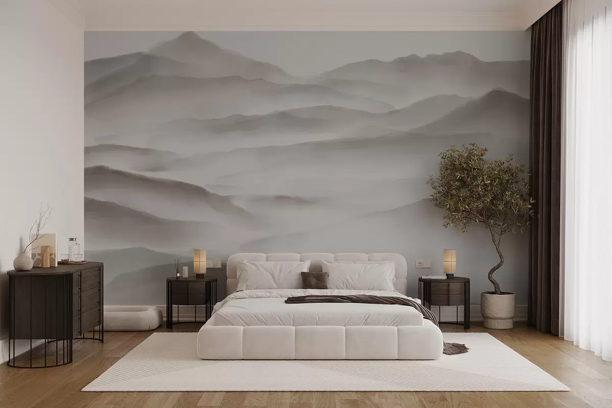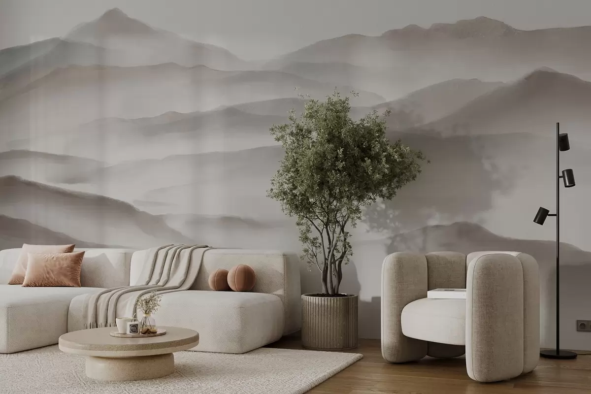 Murais de parede Paisagem de montanha minimalista com colinas e neblina, criando uma impressão serena e atmosférica Nr. w08602