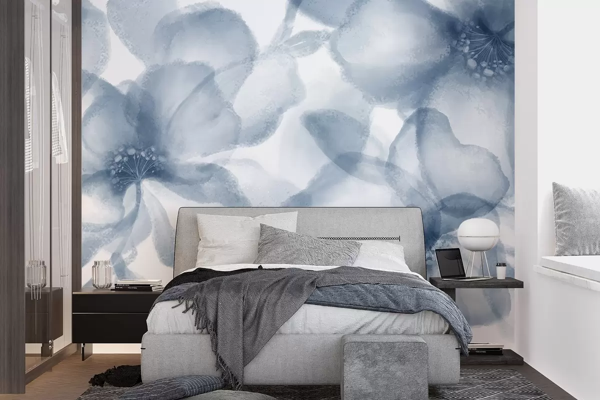 Murais de parede Flores azuis abstratas, suaves e desfocadas, criando uma estampa floral serena e relaxante Nr. w08607