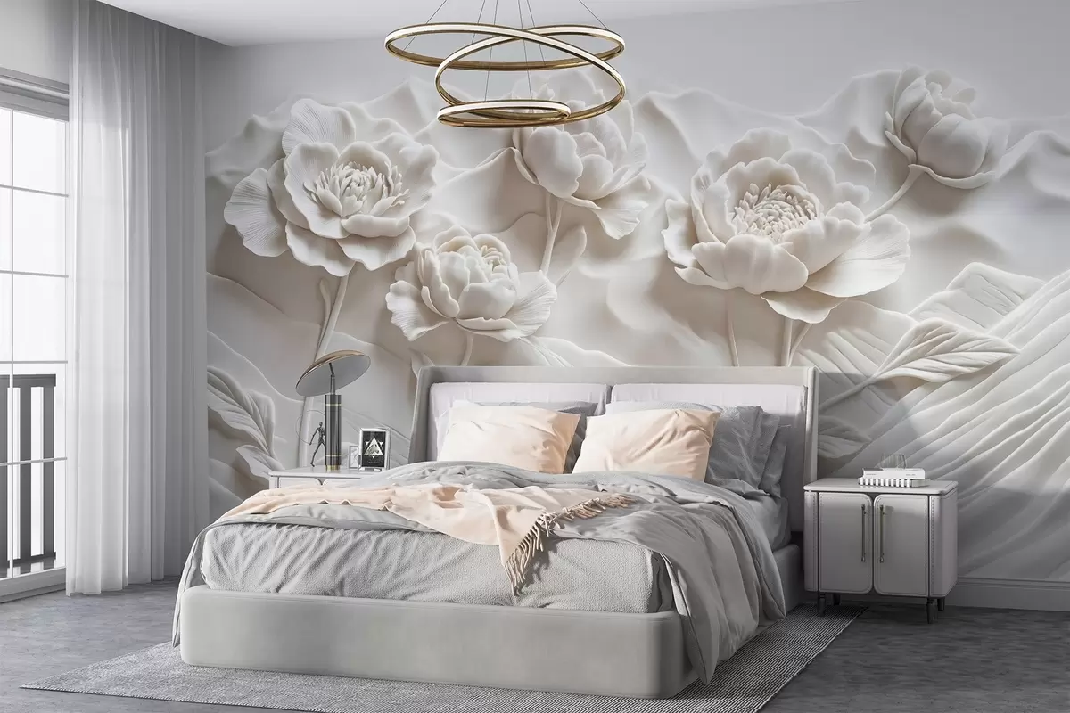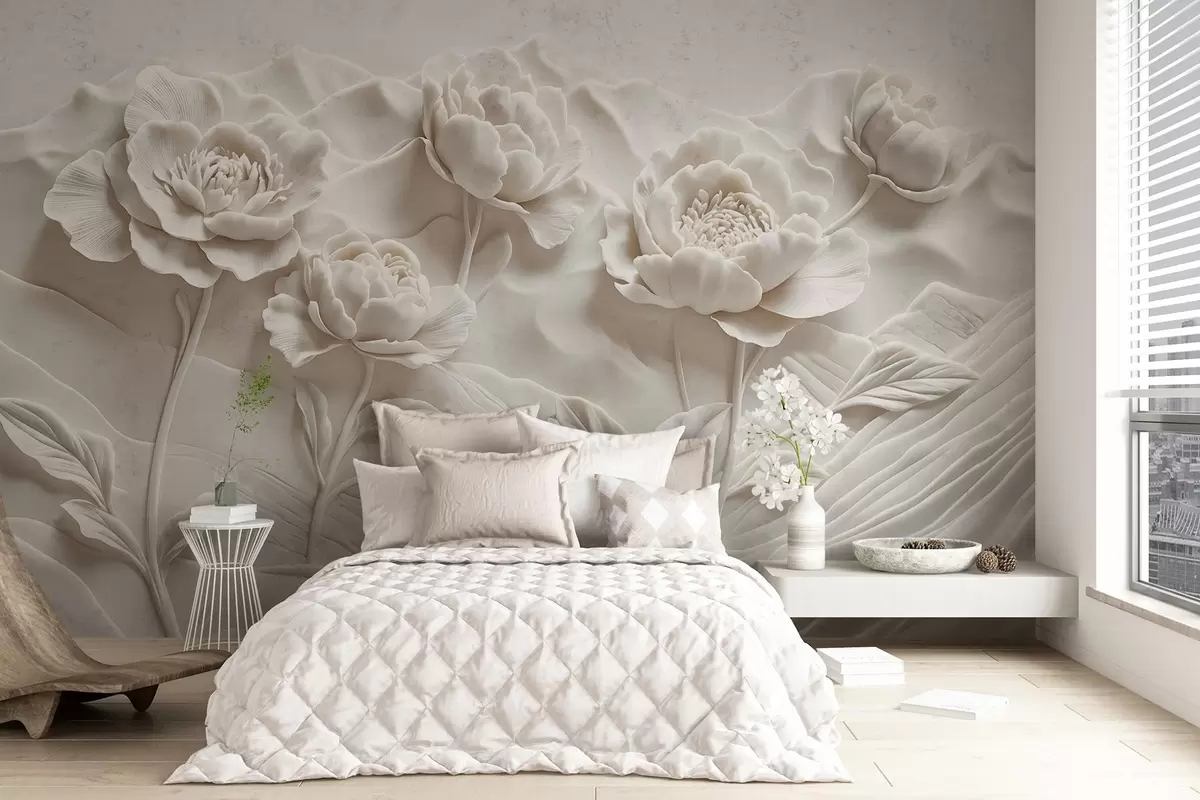Murais de parede Uma imitação floral branca de escultura em relevo com flores de peônia grandes e detalhadas em um fundo liso Nr. w08612