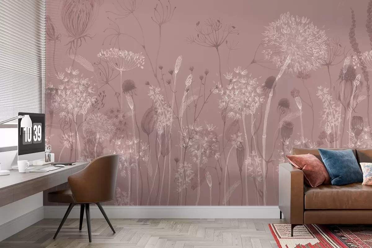 Murais de parede Dentes-de-leão e flores silvestres arejados em estilo aquarela em tons de rosa Nr. w08637v1
