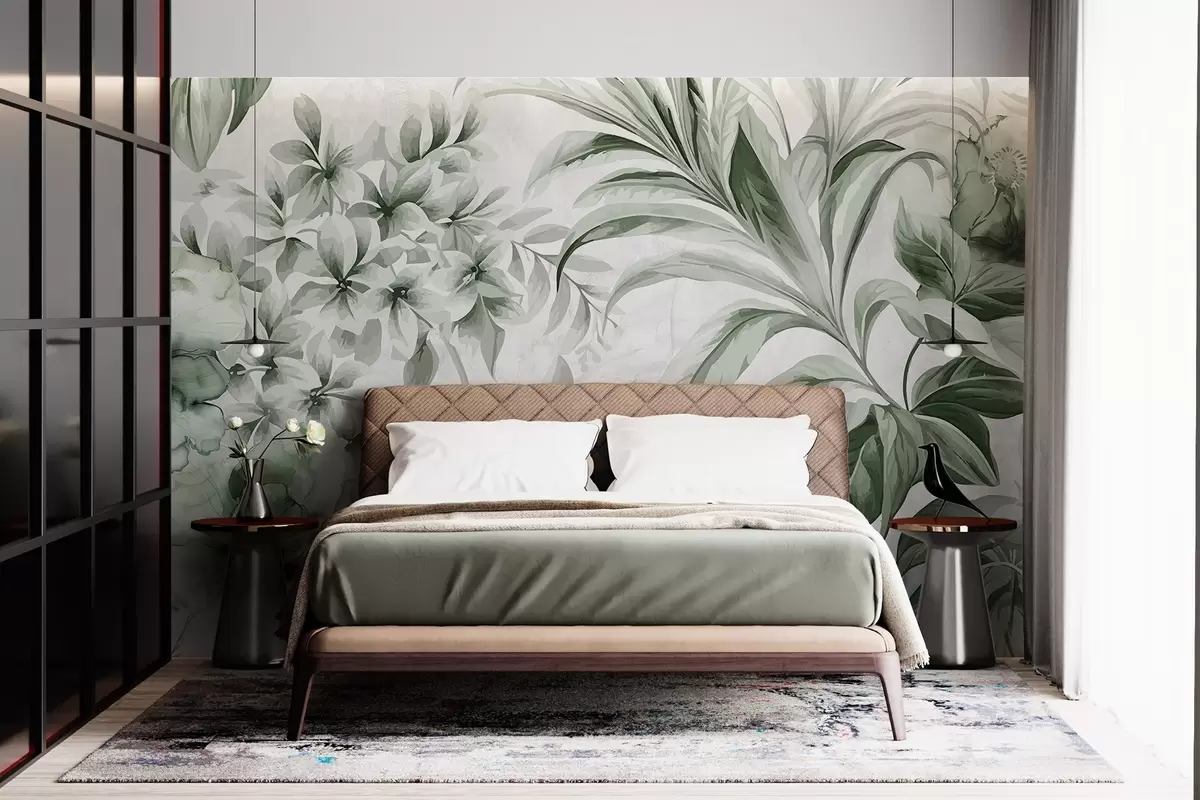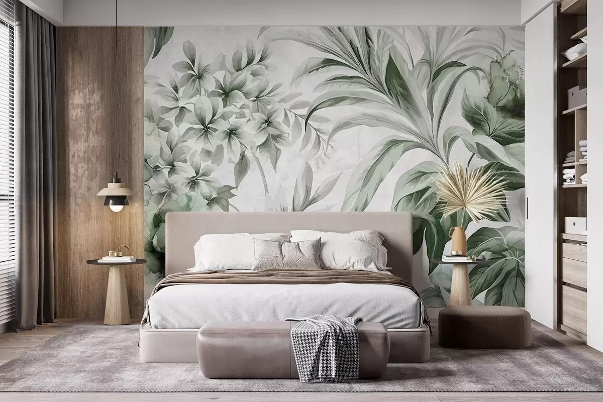 Murais de parede Folhas e folhagens tropicais em uma paleta suave que varia de tons claros a escuros de verde em um fundo claro texturizado Nr. w08650