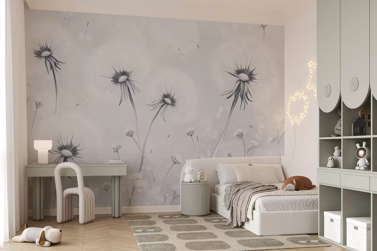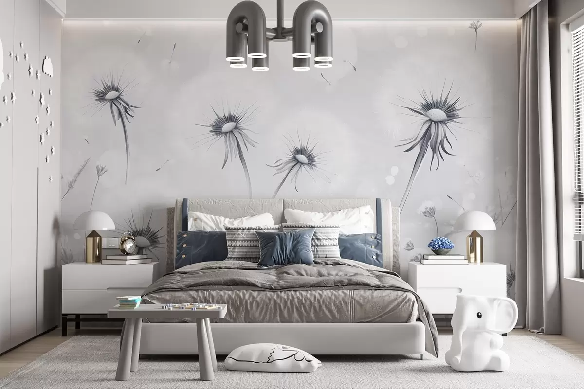 Murais de parede Dentes-de-leão e flores silvestres elegantes em estilo de pintura em tons de azul Nr. w08657v2