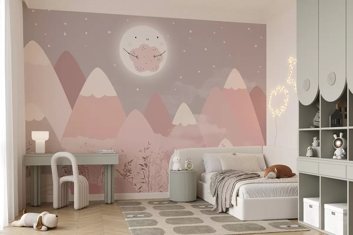 Murais de parede Montanhas infantis com uma linda lua e plantas na parte inferior Nr. w08659