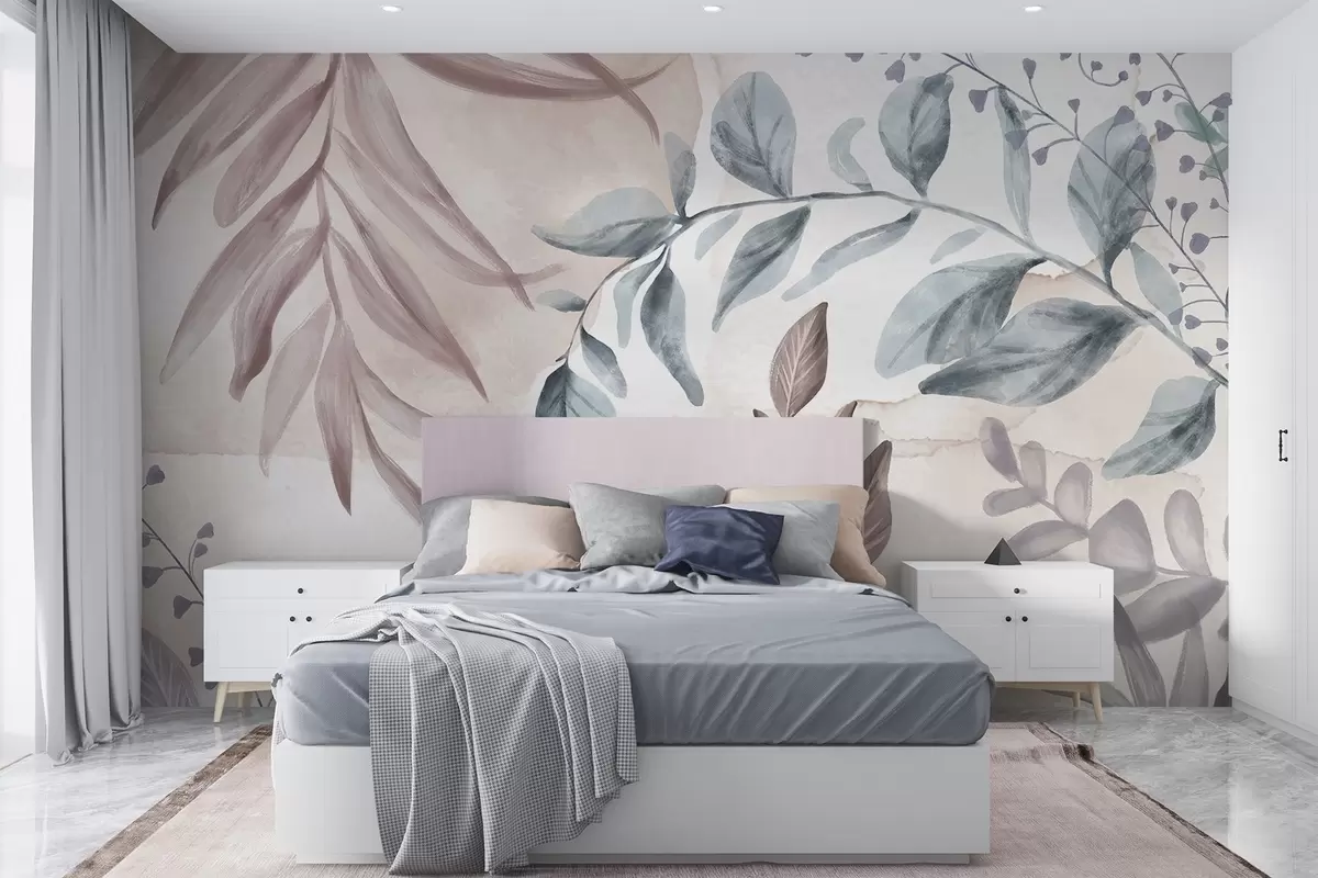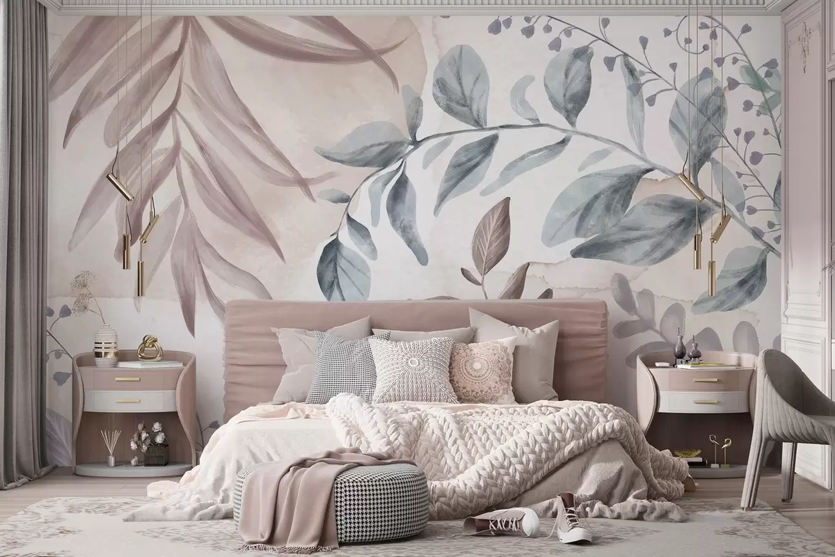 Murais de parede Impressão botânica com folhas e ramos florais em tons pastéis suaves, em um fundo semelhante a uma aquarela Nr. w08668