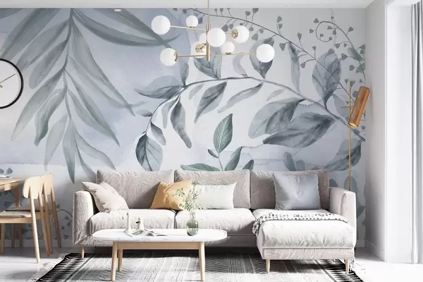 Murais de parede Impressão botânica com folhas e ramos florais em tons pastéis suaves, em um fundo semelhante a uma aquarela Nr. w08668v1