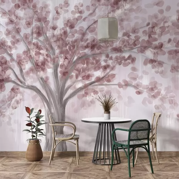 Murais de parede Uma árvore grande com folhas suaves e abstratas em rosa em um fundo claro e neutro que realça os tons da árvore Nr. w08669v2