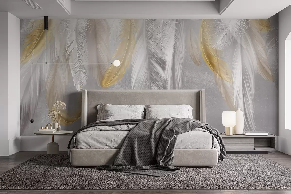 Murais de parede Penas brancas e amarelas penduradas em um fundo cinza suave, criando uma composição delicada e arejada Nr. w08670