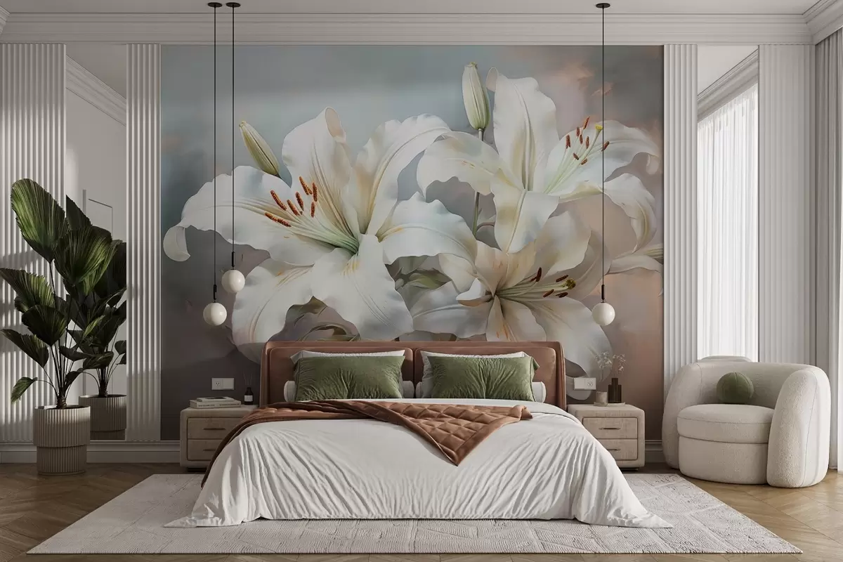 Murais de parede Elegantes lírios brancos em tons pastéis com uma textura que imita pinceladas Nr. w08678