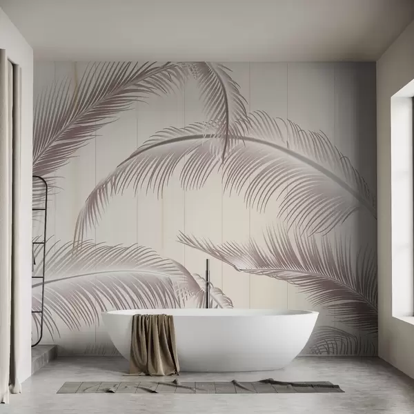 Murais de parede Padrão de penas grandes em tons suaves de rosa e bege em um fundo claro com linhas verticais que dão um toque de elegância Nr. w08685