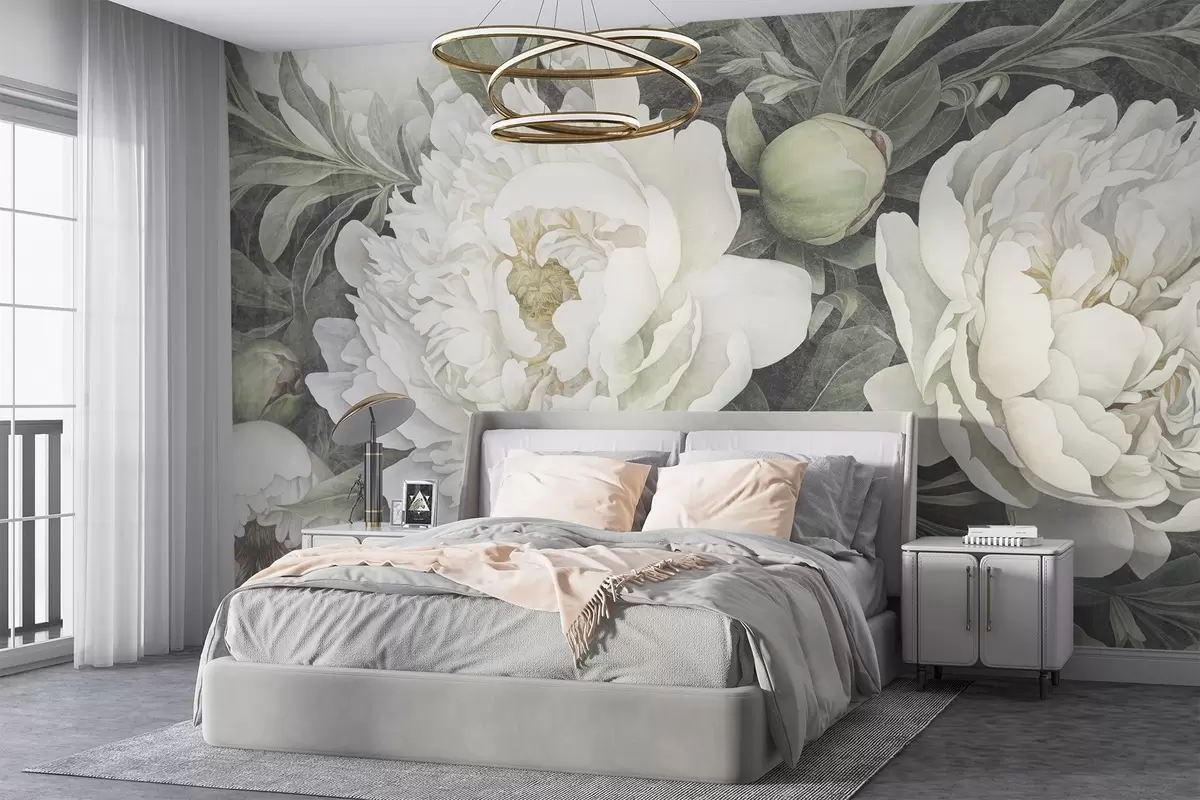 Murais de parede Peônias brancas pastéis texturizadas com botões verdes suaves e folhas com pétalas delicadas Nr. w08697