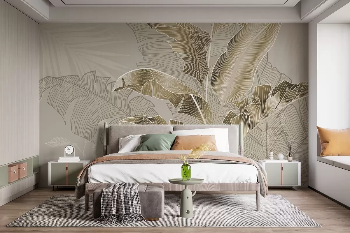 Murais de parede Uma composição harmoniosa de folhas tropicais em tons de bege e marrom, com trabalho de linha detalhado Nr. w08698