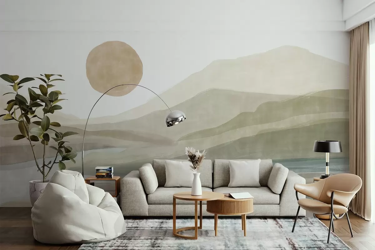 Murais de parede Uma paisagem de montanhas em camadas com um gradiente suave, um rio sinuoso, um sol laranja suave no céu Nr. w08702