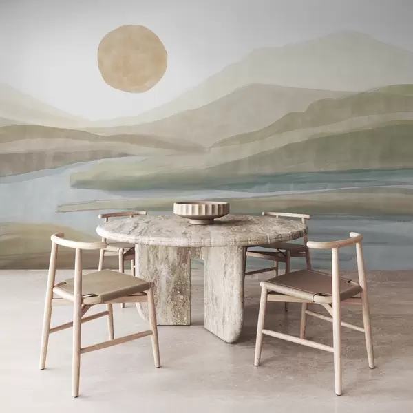 murais de parede Uma paisagem de montanhas em camadas com um gradiente suave, um rio sinuoso, um sol laranja suave no céu w08702