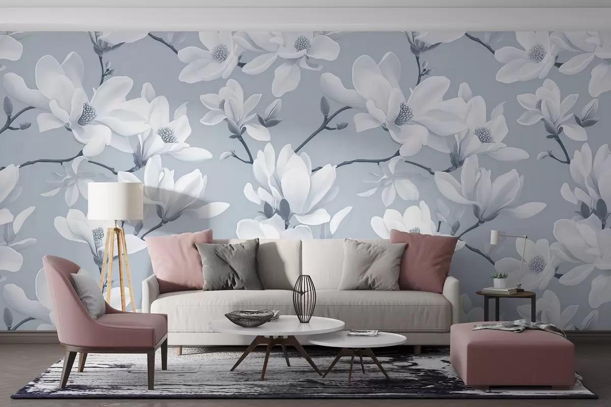 Murais de parede Padrão de flores de magnólia brancas, em tons de azul claro, folhas e galhos brancos Nr. w08726v2