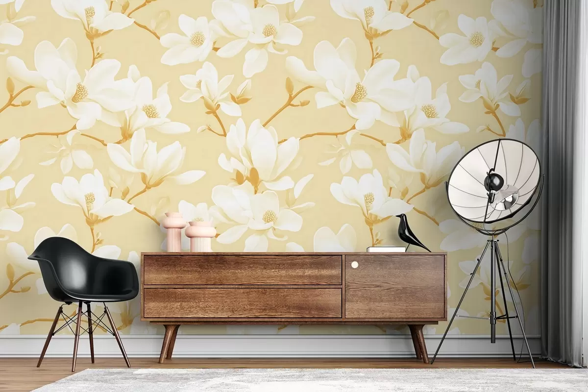 Murais de parede Padrão de flores de magnólia brancas, em tons de amarelo, folhas e galhos brancos Nr. w08726v3