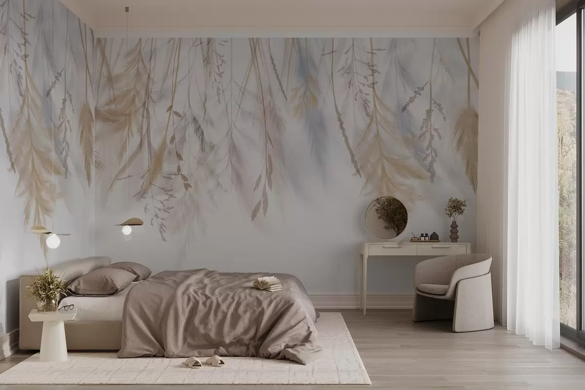 Murais de parede Gramíneas delicadas, espiguetas e plantas em tons pastéis, dispostas em uma estampa em cascata contra um fundo claro Nr. w08737