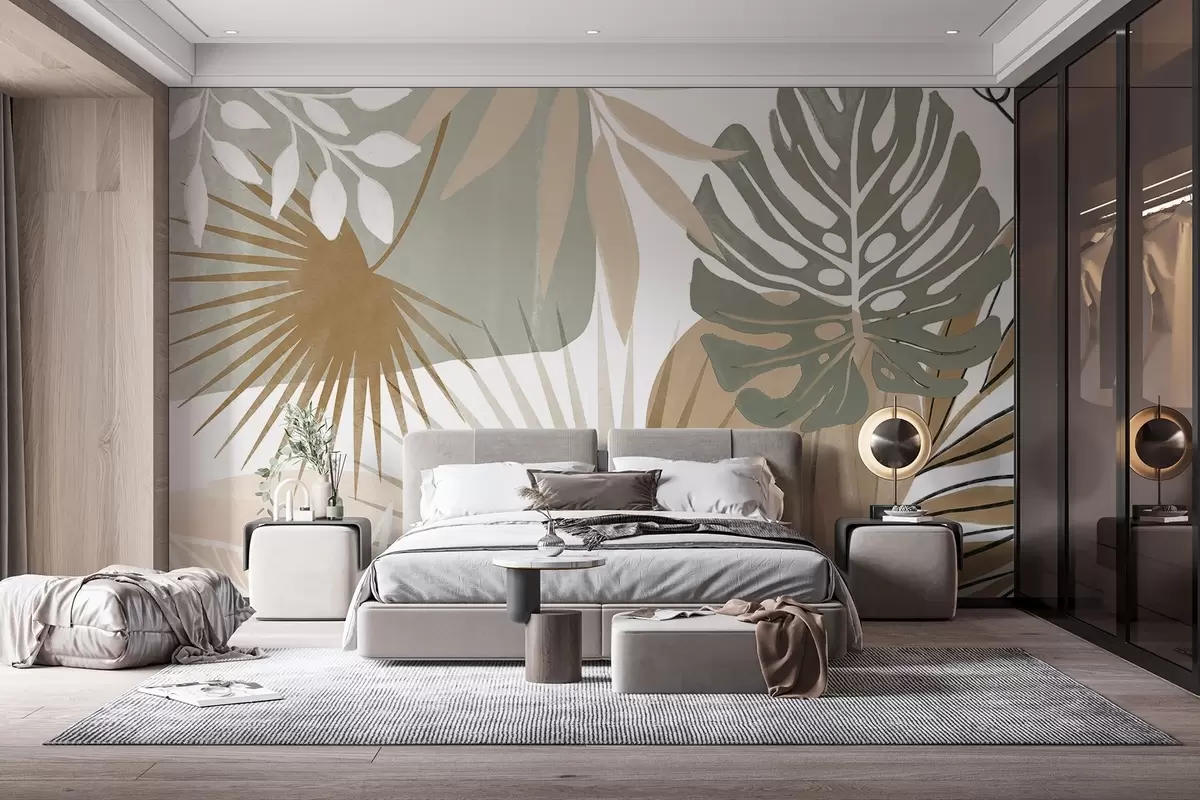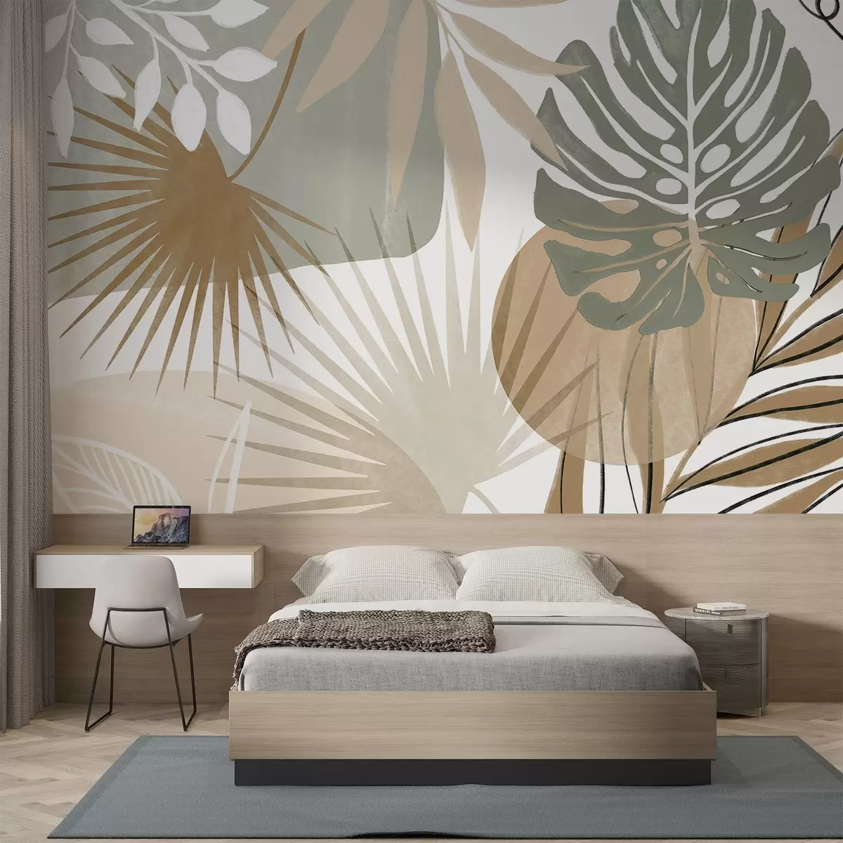 Murais de parede Desenho abstrato com várias folhas tropicais em tons terrosos de verde, bege e creme Nr. w08738v1