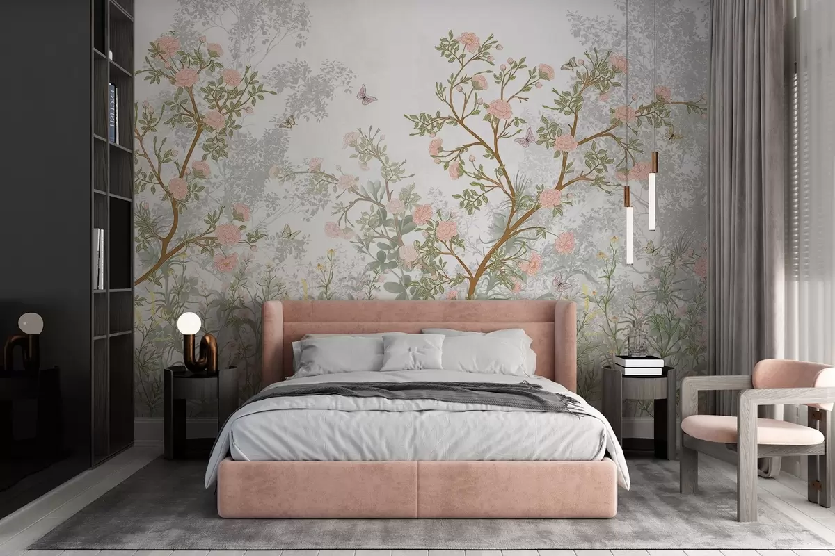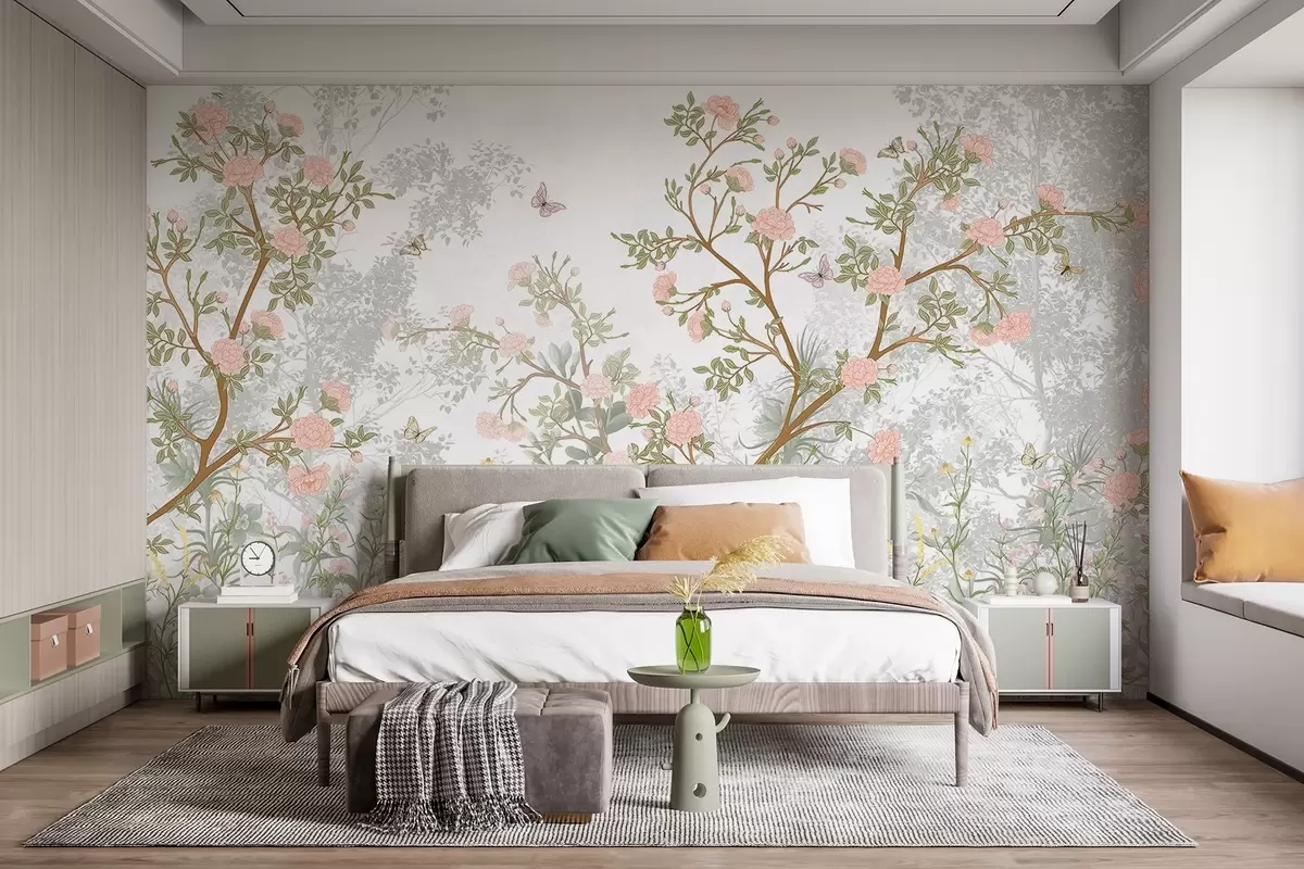 Murais de parede Delicadas árvores com flores cor-de-rosa, borboletas voando e folhas verdes entrelaçadas com galhos finos Nr. w08744