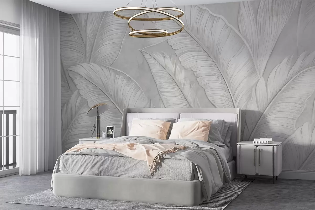Murais de parede Grandes folhas tropicais com detalhes de alta textura em uma cor cinza claro monocromática em estilo loft Nr. w08772