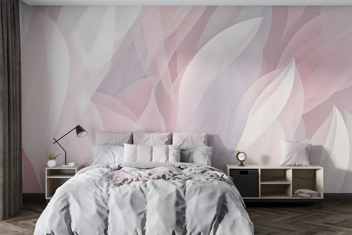 Murais de parede Design abstrato com formas suaves de pétalas em tons de rosa e branco, criando um efeito de camadas Nr. w08774