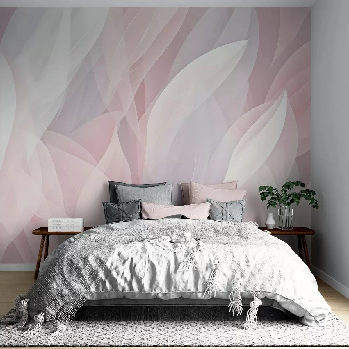 Murais de parede Design abstrato com formas suaves de pétalas em tons de rosa e branco, criando um efeito de camadas Nr. w08774