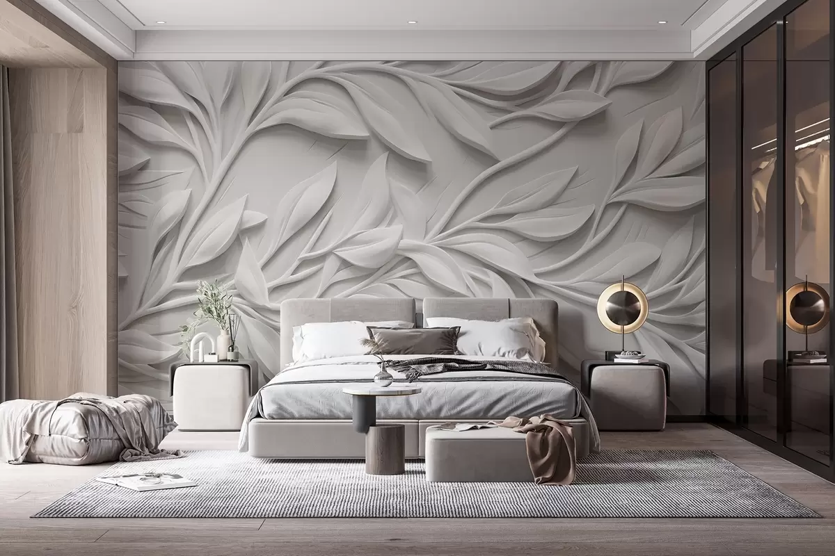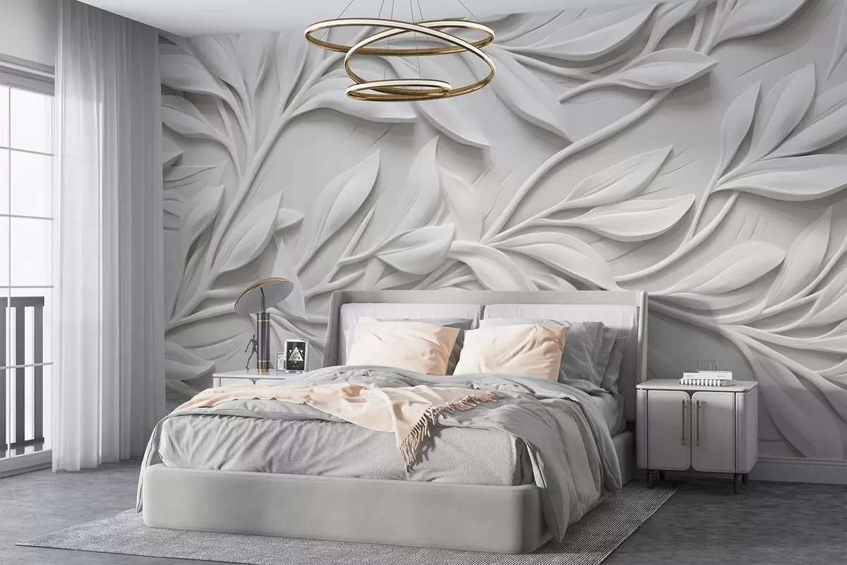 Murais de parede Estampa texturizada branca com folhas e galhos, criando um efeito de imitação volumosa em um fundo texturizado Nr. w08778