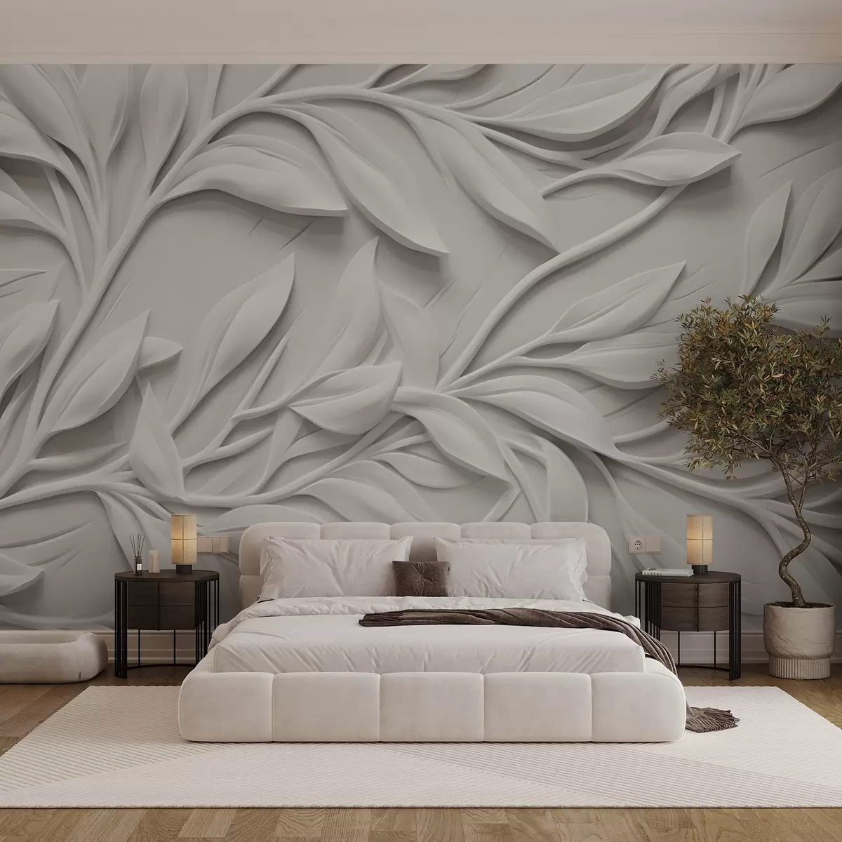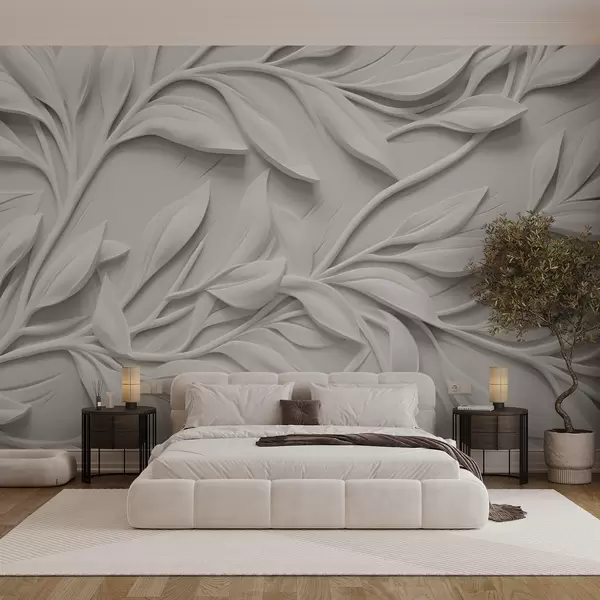 Murais de parede Estampa texturizada branca com folhas e galhos, criando um efeito de imitação volumosa em um fundo texturizado Nr. w08778