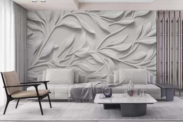 Murais de parede Estampa texturizada branca com folhas e galhos, criando um efeito de imitação volumosa em um fundo texturizado Nr. w08778