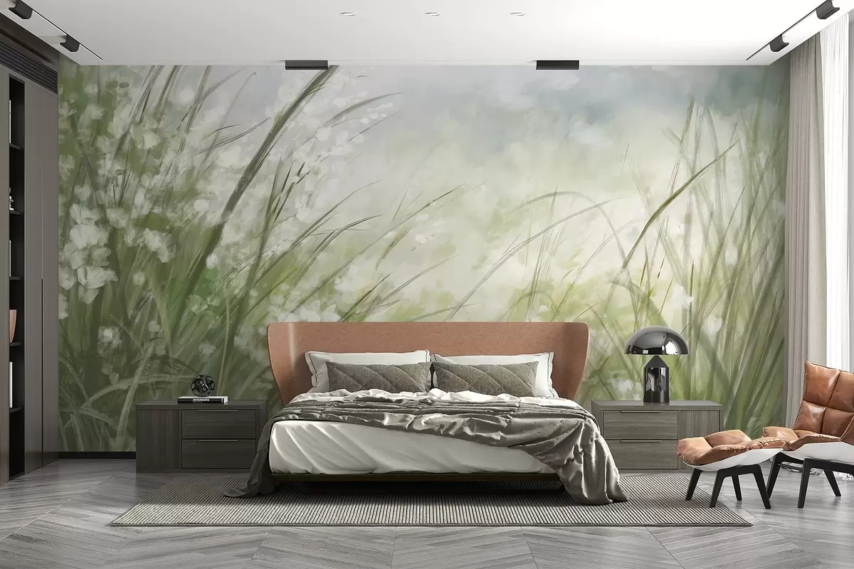 Murais de parede Grama verde exuberante com delicadas flores brancas, estampa suavemente borrada com tons claros, criando uma paisagem tranquila Nr. w08779