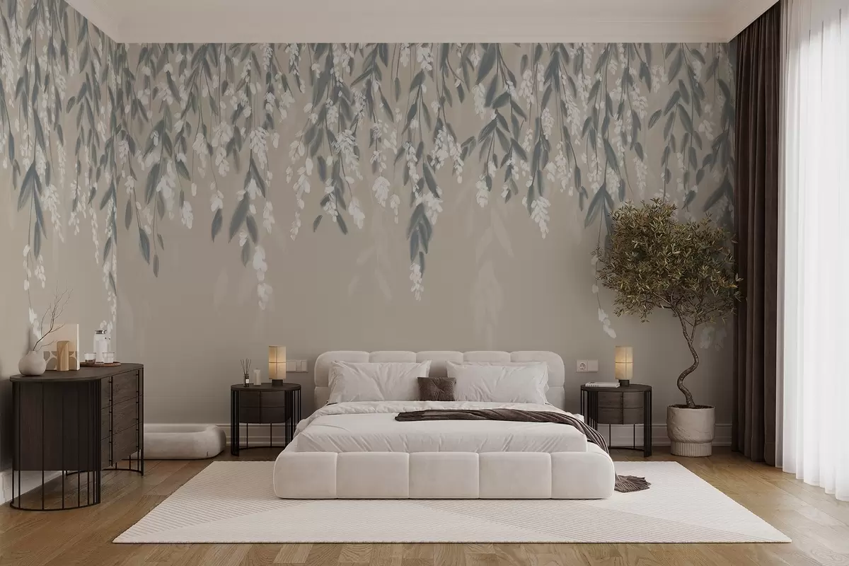 Murais de parede Ramos de folhagem em cascata em tons de verde suave com flores e folhas brancas sobre fundo bege Nr. w08781