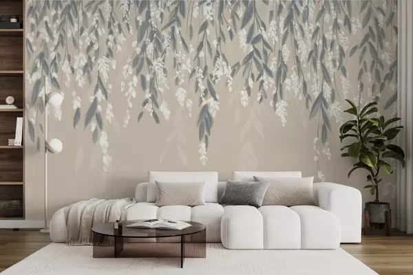 Murais de parede Ramos de folhagem em cascata em tons de verde suave com flores e folhas brancas sobre fundo bege Nr. w08781