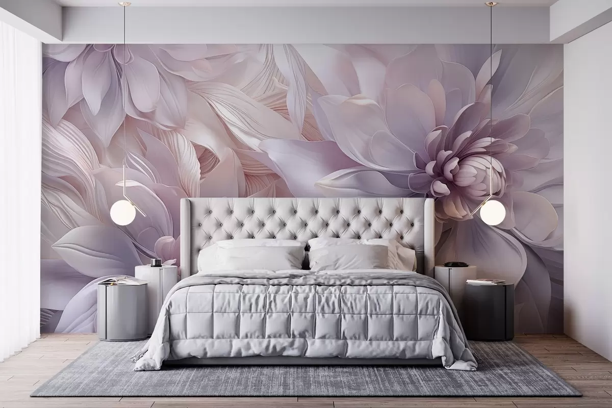 Murais de parede Flores suaves e em camadas em tons de rosa pálido, lavanda e branco com pétalas delicadas e detalhes intrincados Nr. w08783