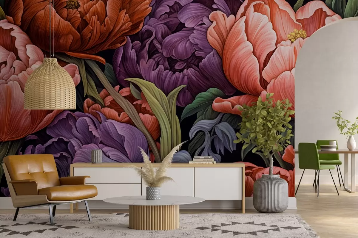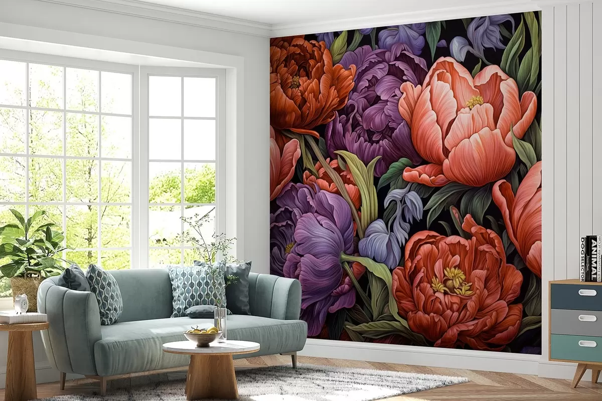 Murais de parede Tulipas e peônias em estilo vitoriano, nas cores vermelha e roxa Nr. w08818v1