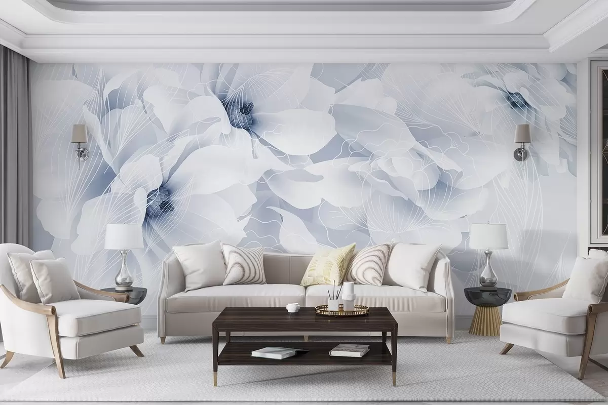 Murais de parede Flores de peônia em tons pastéis com pétalas delicadas brancas e azuis e linhas brancas em um fundo azul claro Nr. w08826