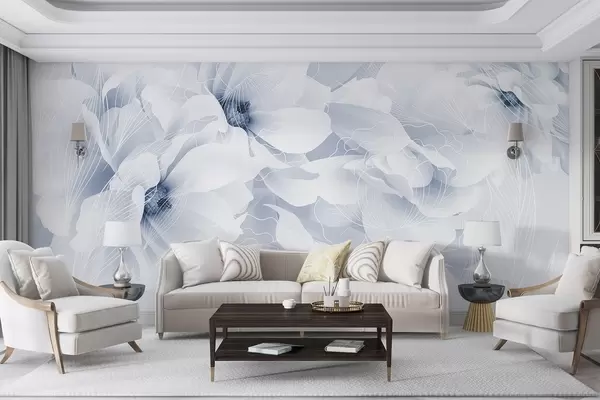 murais de parede Flores de peônia em tons pastéis com pétalas delicadas brancas e azuis e linhas brancas em um fundo azul claro w08826