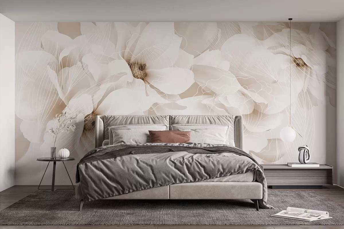 Murais de parede Flores de peônia em tons pastéis com pétalas delicadas brancas e bege e linhas brancas em um fundo bege claro Nr. w08826v1