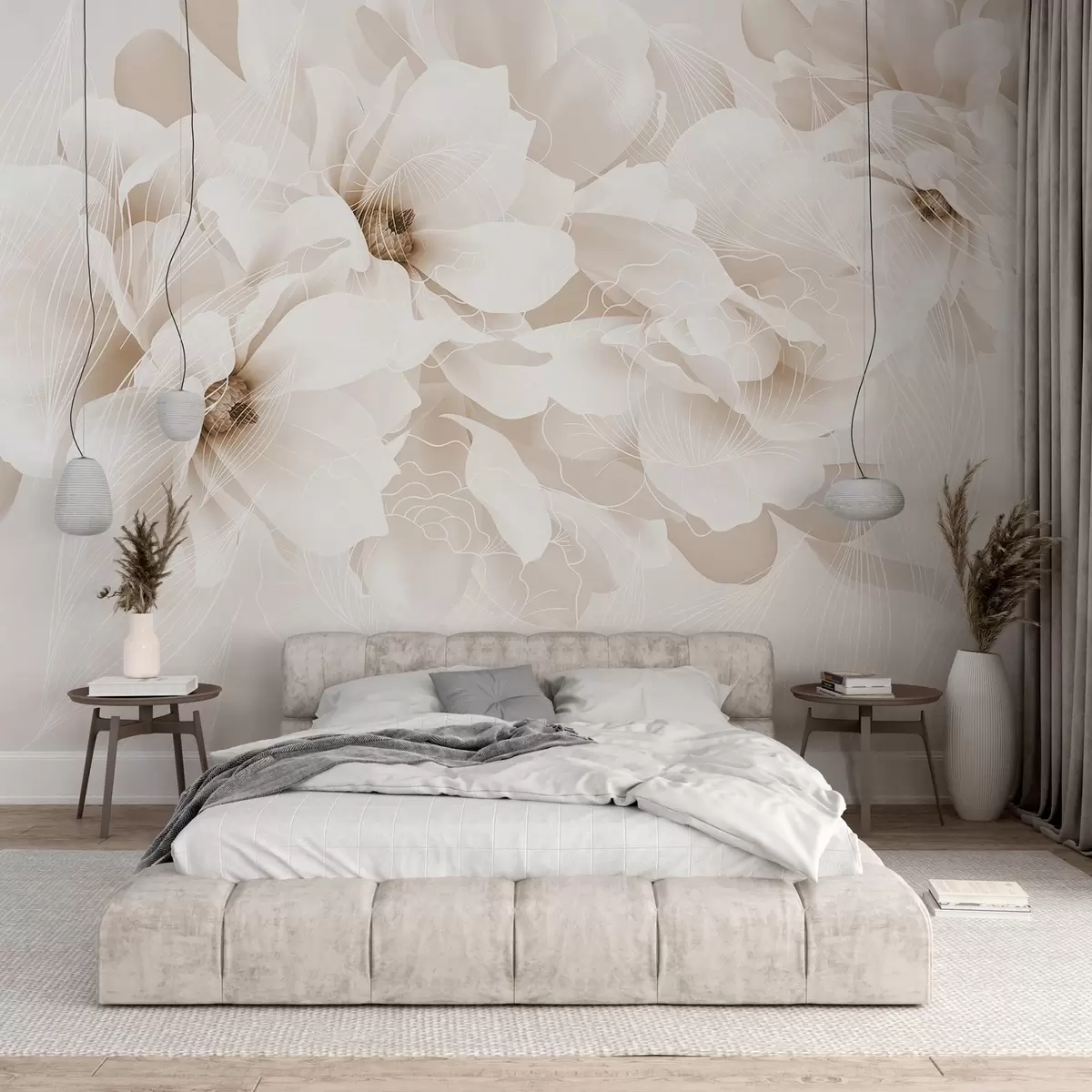 murais de parede Flores de peônia em tons pastéis com pétalas delicadas brancas e bege e linhas brancas em um fundo bege claro w08826v1