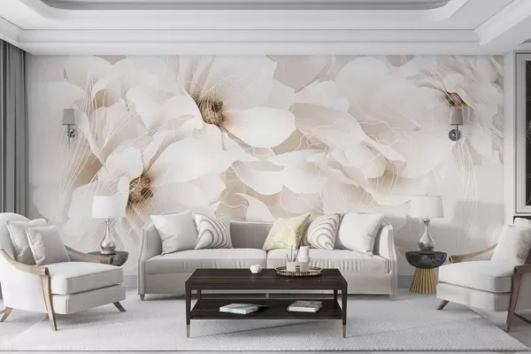 Murais de parede Flores de peônia em tons pastéis com pétalas delicadas brancas e bege e linhas brancas em um fundo bege claro Nr. w08826v1