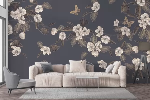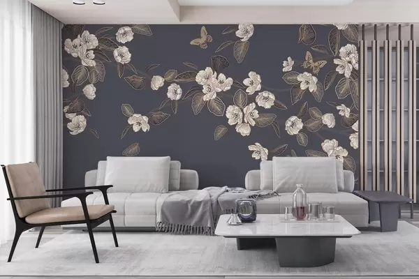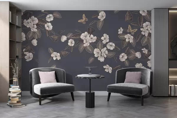 Murais de parede Galho de cerejeira em flor com flores, folhas e borboletas em um fundo cinza escuro Nr. w08830