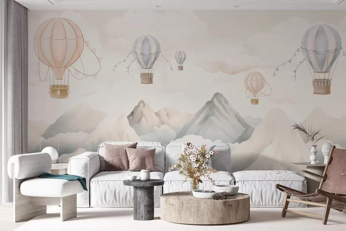 Murais de parede Balões de ar quente flutuando sobre montanhas em tons pastéis neutros e suaves Nr. w08853