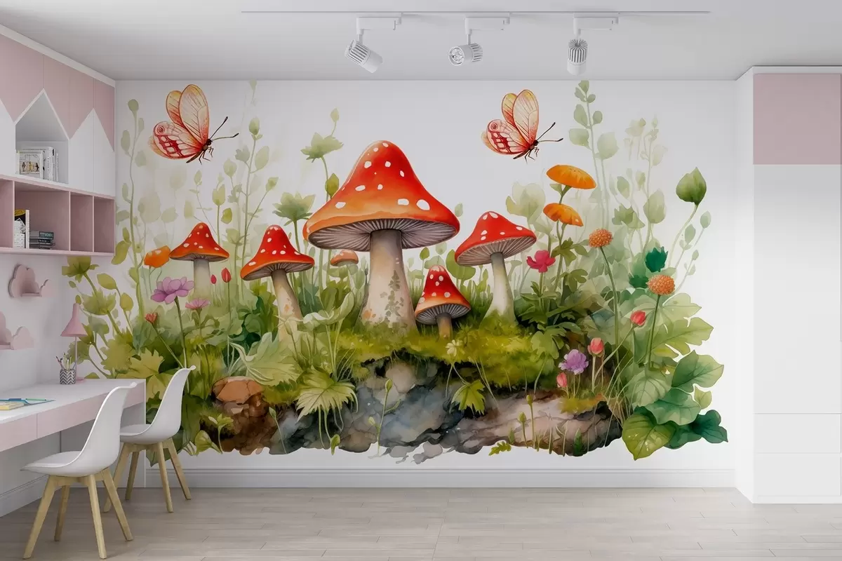 Murais de parede Uma paisagem de floresta em um fundo branco em estilo aquarela com cogumelos, sapos e borboletas Nr. w08854