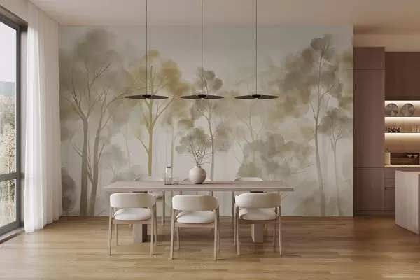 Murais de parede Floresta em estilo aquarela com árvores altas de cores claras em tons de bege e amarelo, com uma atmosfera de neblina Nr. w08870