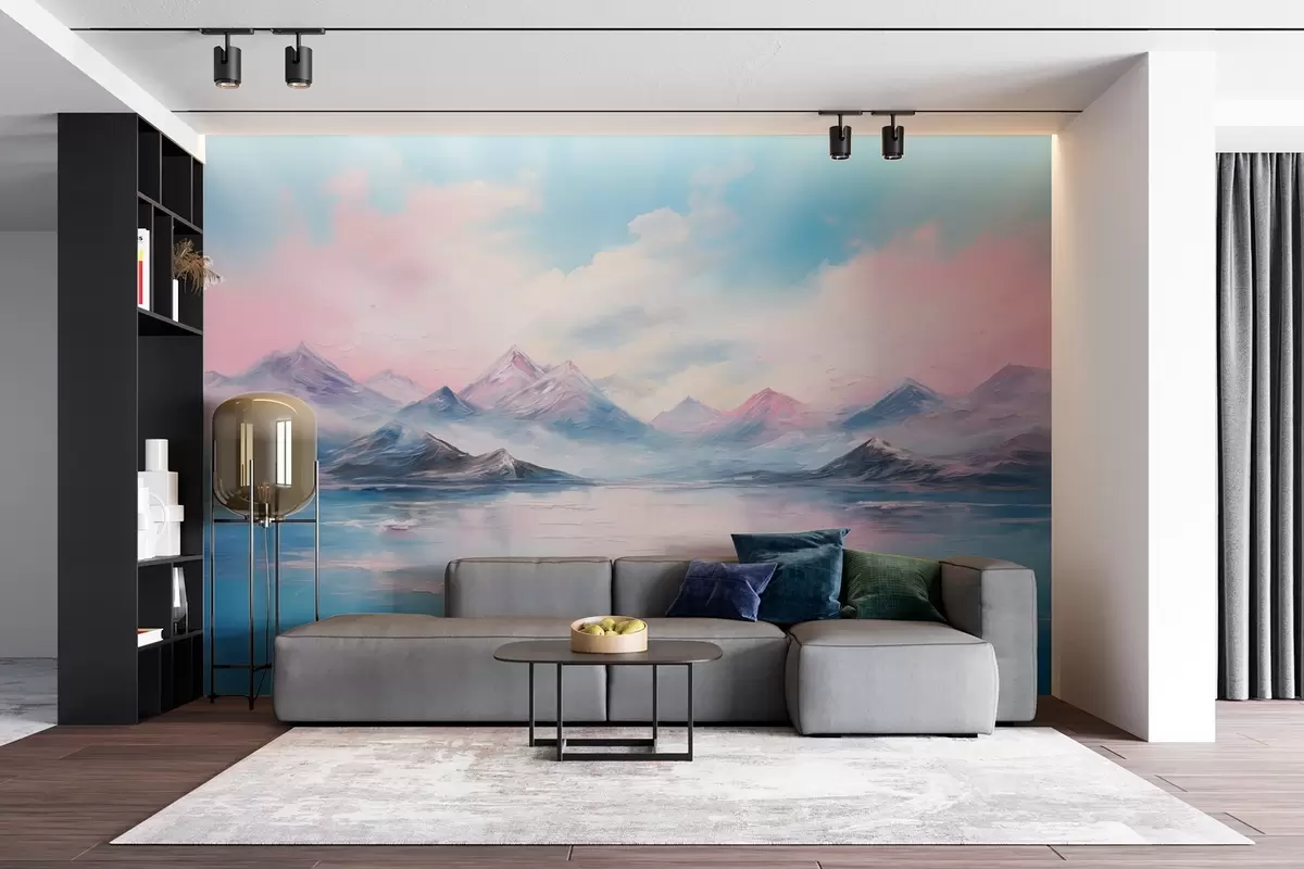 murais de parede Uma paisagem colorida em estilo de pincelada em tons de rosa e azul, com montanhas, um lago e nuvens w08878