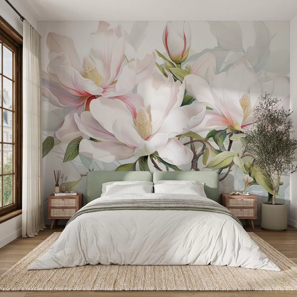 Murais de parede Flores de magnólia com pétalas brancas e rosa, folhas e galhos marrons, estilo aquarela suave e delicado Nr. w08885