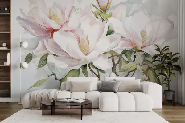Murais de parede Flores de magnólia com pétalas brancas e rosa, folhas e galhos marrons, estilo aquarela suave e delicado Nr. w08885